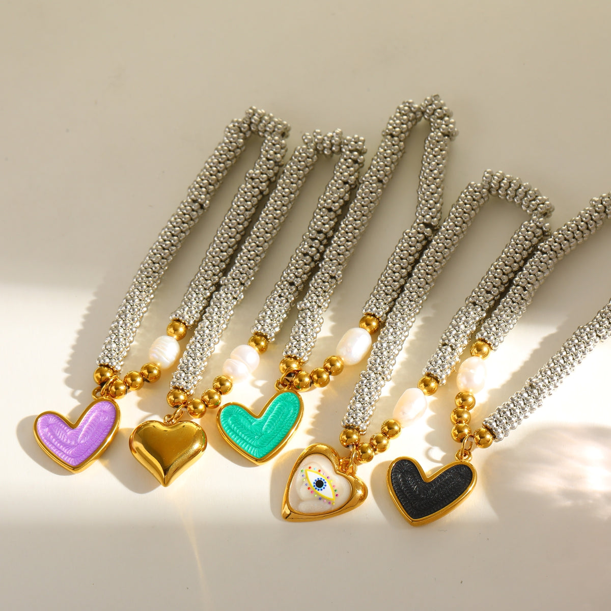 Material: Stainless steel woven band with high-shine finish, natural pearl; gold-plated heart charm with guardian eye motif. Hypoallergenic.