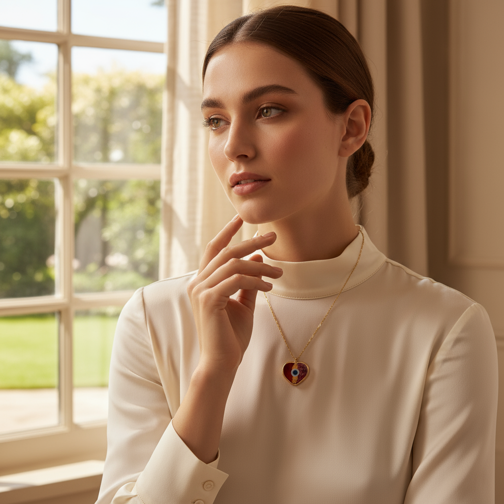 Introducing the Crimson Aegis Heart Necklace, a powerful talisman combining protective energy with elevated elegance. The red marbled heart, gold-veined detailing, and signature evil-eye center make this piece a standout symbol of courage, intuition, and refined style.