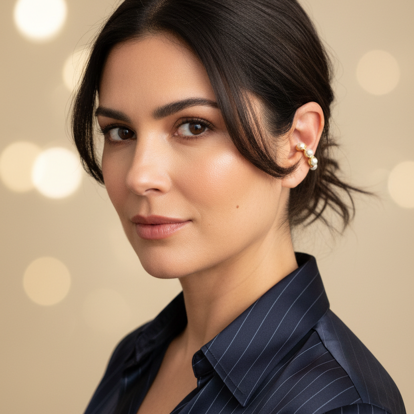 Illuminate your look with the Celestial Pearl Cuff, a luminous ear cuff inspired by the soft glow of moonlight. Designed with smooth 18k gold–plated curves and glossy pearl accents, this sculptural piece evokes the elegance of orbiting stars and cosmic radiance.