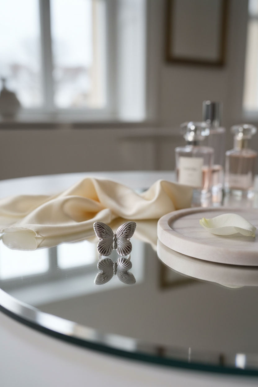 Style Note: Choose the Flutter Ring – Silver for sleek, minimal outfits or when you want to add a soft shimmer to your look. Stunning with whites, creams, greys, florals, and tailored silhouettes.