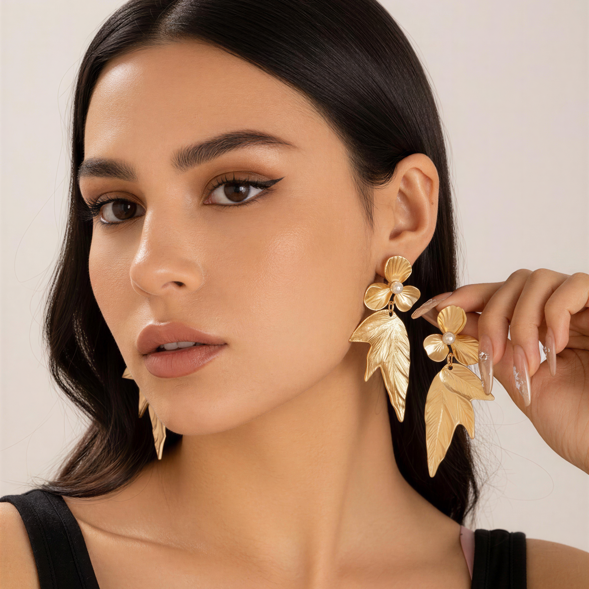 Where nature and artistry entwine — the Golden Gingko Fleur Earrings capture the magic of a golden bloom in motion. Hand-sculpted gingko-shaped petals unfold around a luminous artificial pearl, while cascading leaves shimmer with delicate texture and light.