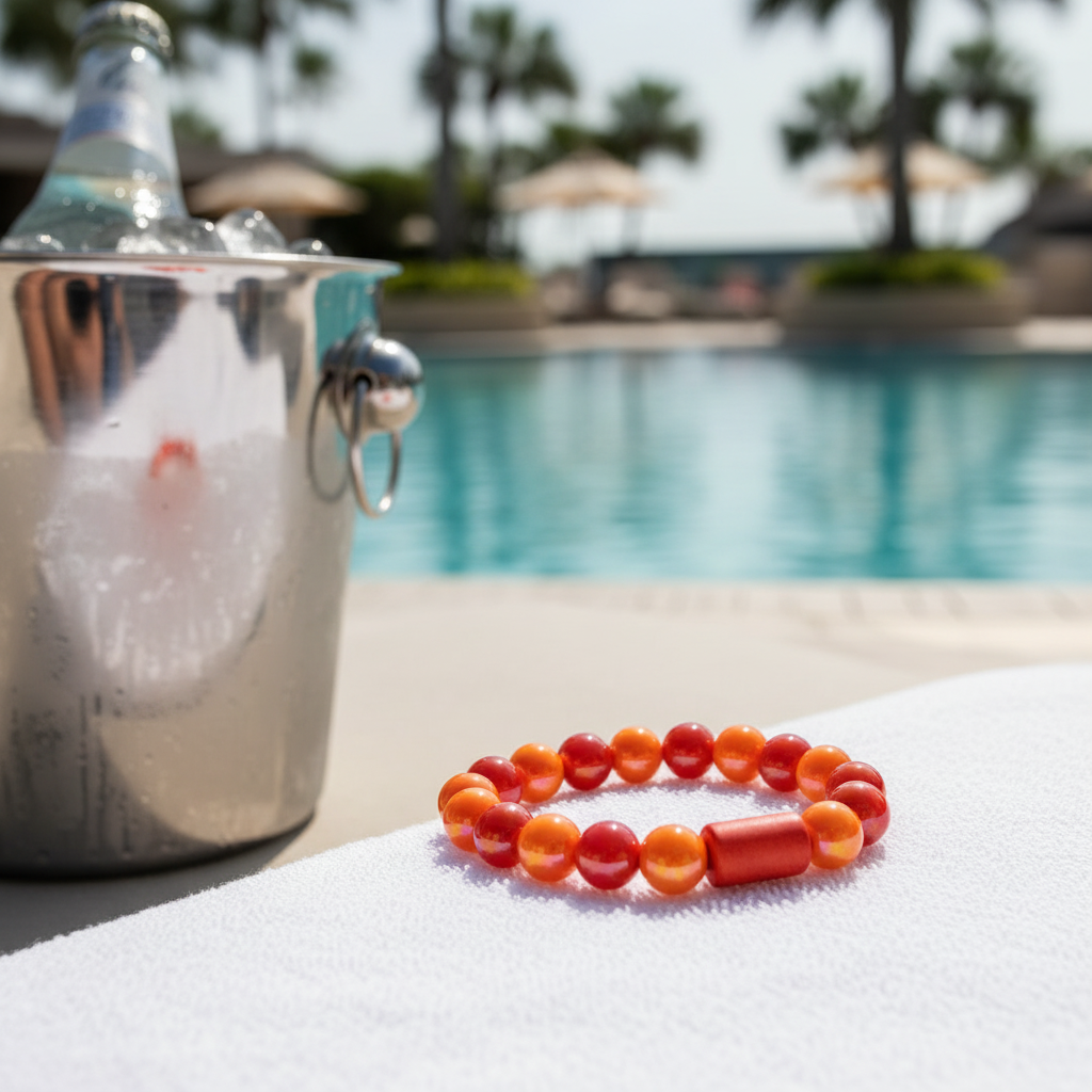 Warm, juicy orange pearls and marbled tones come together in the Sunset Sorbet Bracelet, inspired by golden-hour skies and tropical summer escapes. Softly glowing colors wrap the wrist in a playful yet refined pop of brightness — the perfect accessory for pool days, beach getaways, or anytime you want to bring a little sunshine into your style.