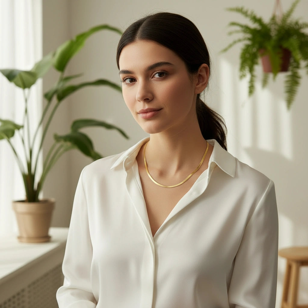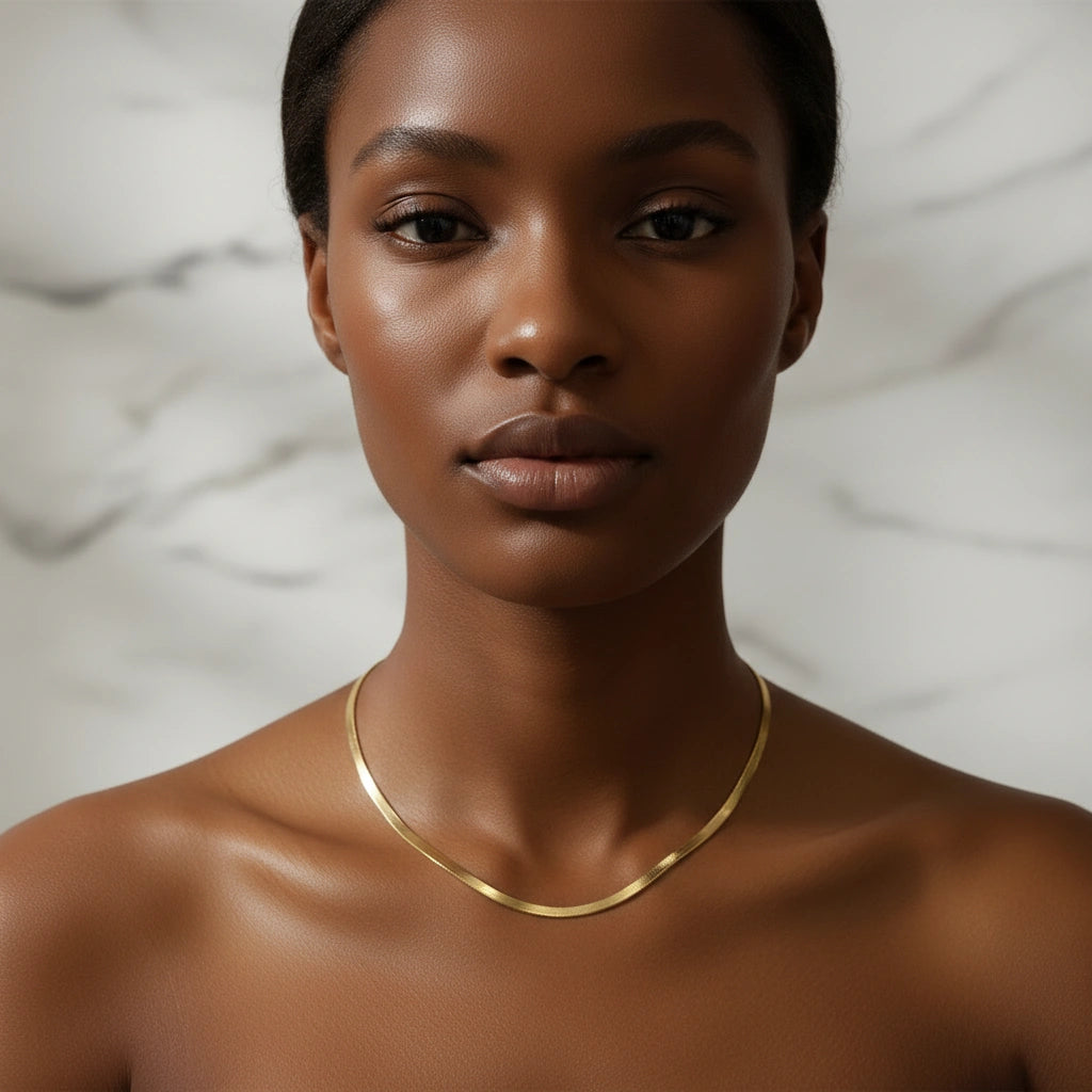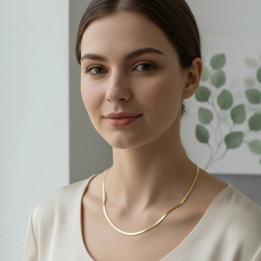 Refined, fluid, and endlessly versatile — the Sleek Glide Chain brings effortless polish to every look. At 4mm wide, this chain offers a softer, more delicate take on the classic herringbone silhouette while still catching the light with a beautiful liquid-gold shine.